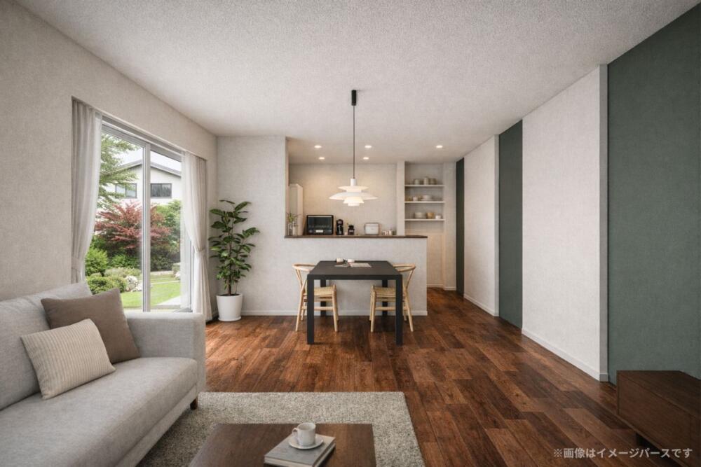 一歩中に入ると、木の床とやわらかな白をベースに、落ち着いたアクセントカラーが効いたLDK。
