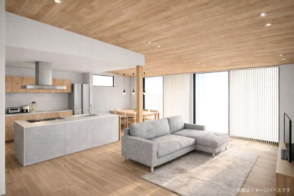 内装は、天井の板張りとグレートーンを基調に、色数を抑えたコーディネート。家具や日用品が増えても雑多に見えにくく、“片付いて見える空間”が自然と保てます。