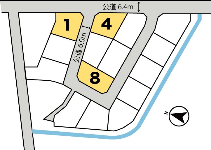 | 接道 | (1)東側 公道6.4m、南側 公道6.0m (4)東側 公道6.4m、北 公道6.0m (8)北側 公道6.0m、西側 公道6.0m、南側 公道6.0m |