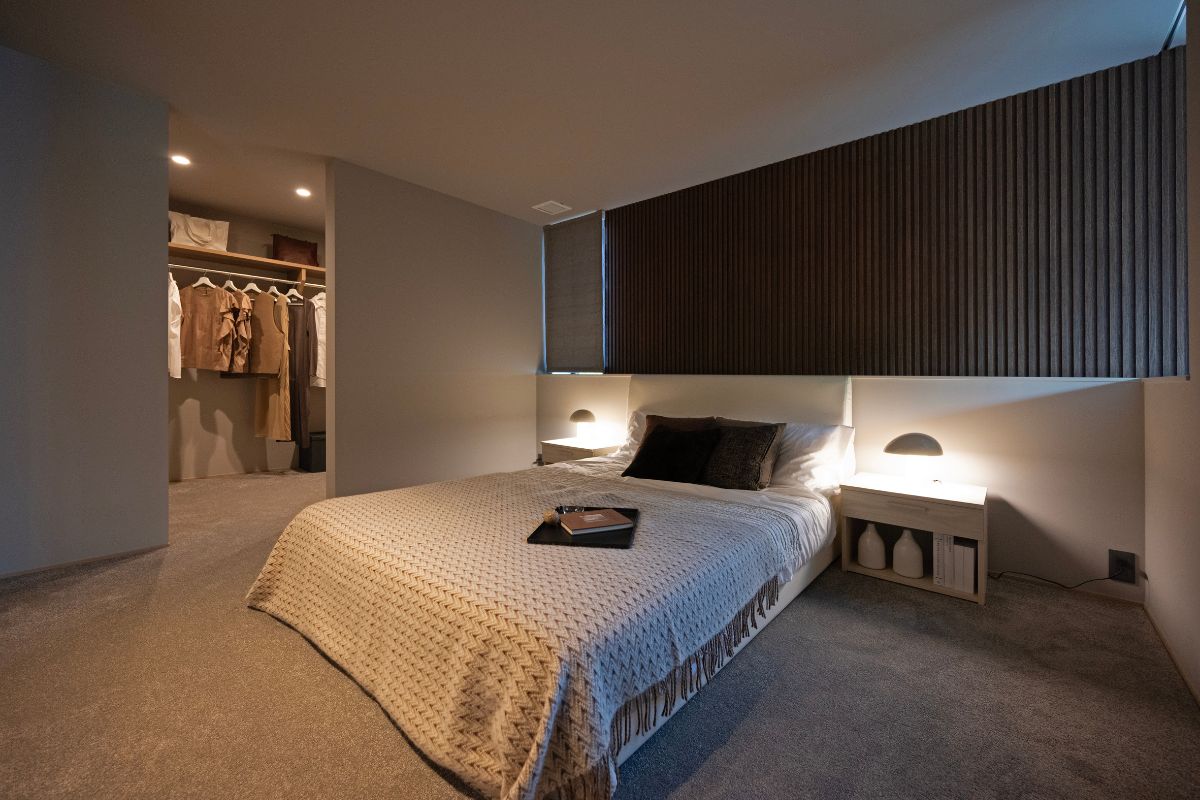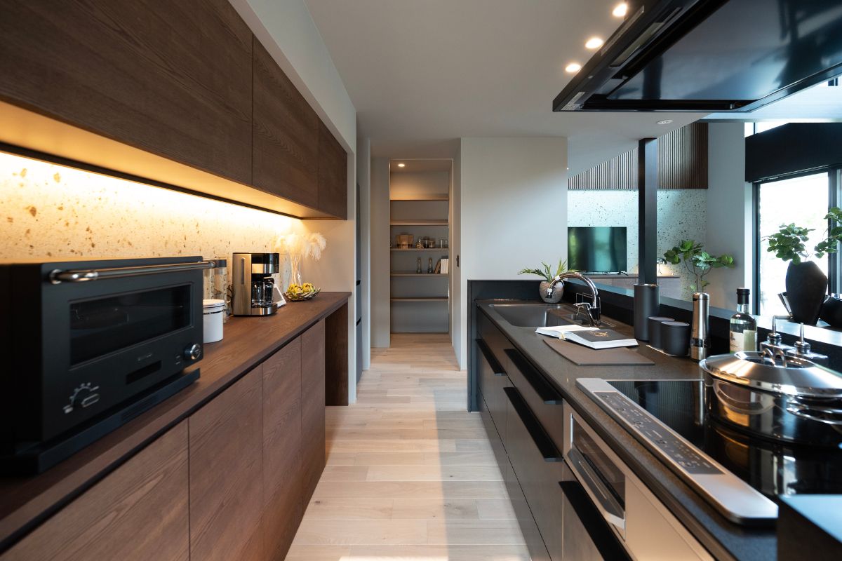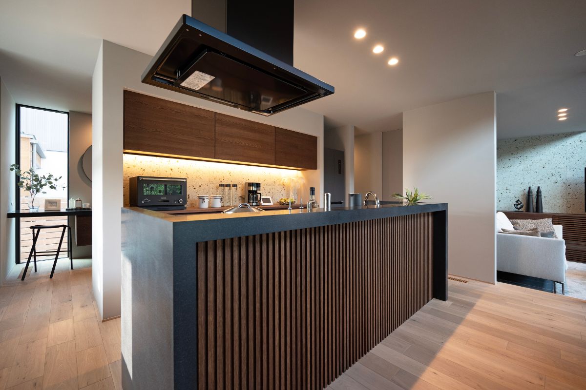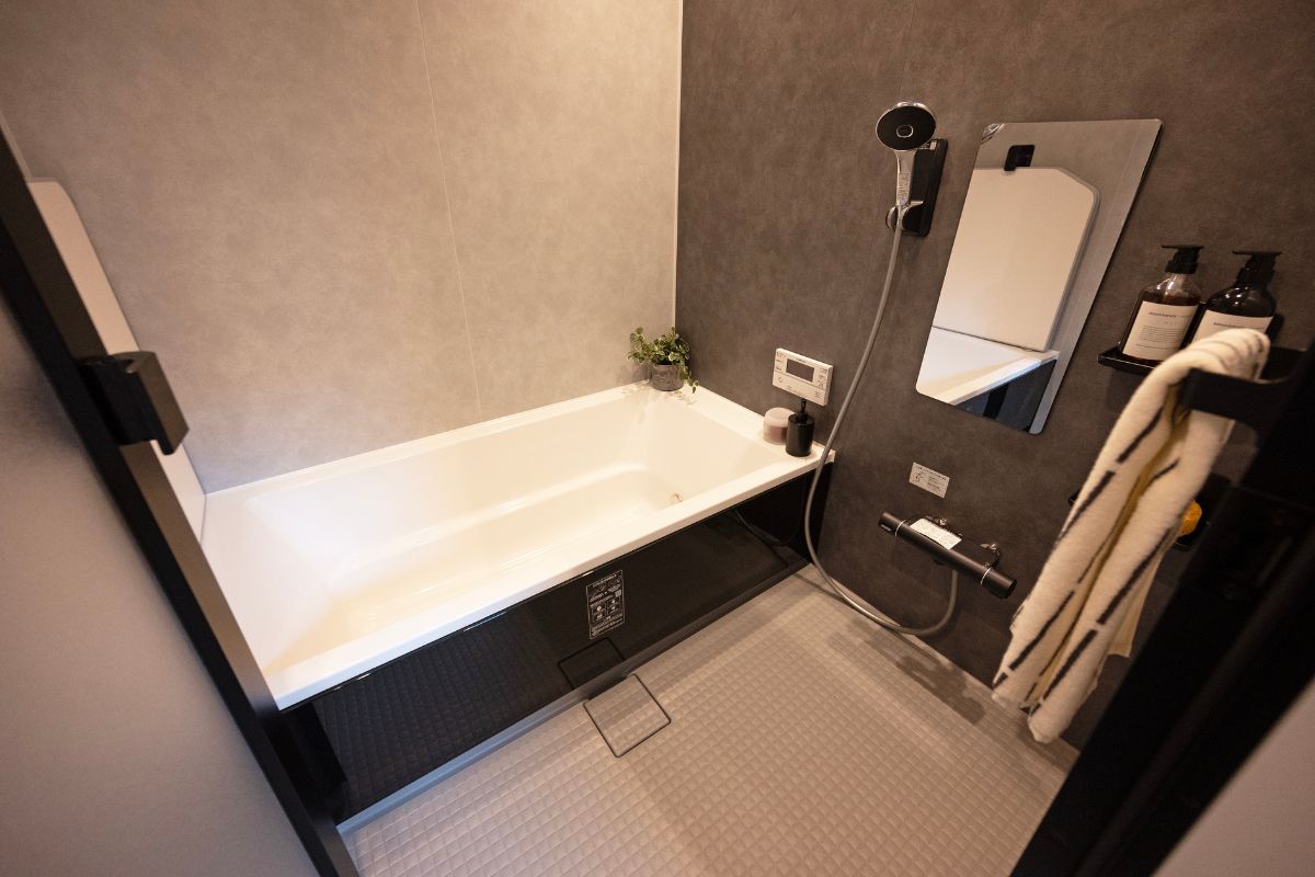 全体はグレーをベースに、アクセントのダーク系のカラーが映える内装。タイルや家具の素材感が高級感を引き立て、統一感のあるデザインに。
