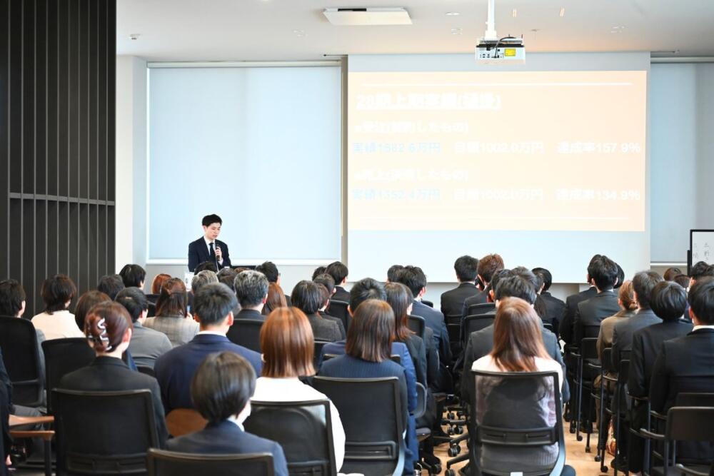 また、新入社員の配属発表や、上期に活躍した社員への表彰も行われ、会場には温かい拍手が送られました。
