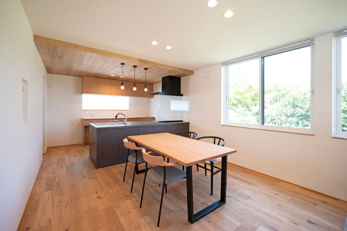 大きな窓から自然光がたっぷり注ぎ込むLDK。ナチュラルな木目の床と天井が、やさしい時間をつくり出します。ソファでくつろぎながら会話が弾み、キッチンでは家族の様子を感じながら料理ができる、心地よい距離感のある空間です。