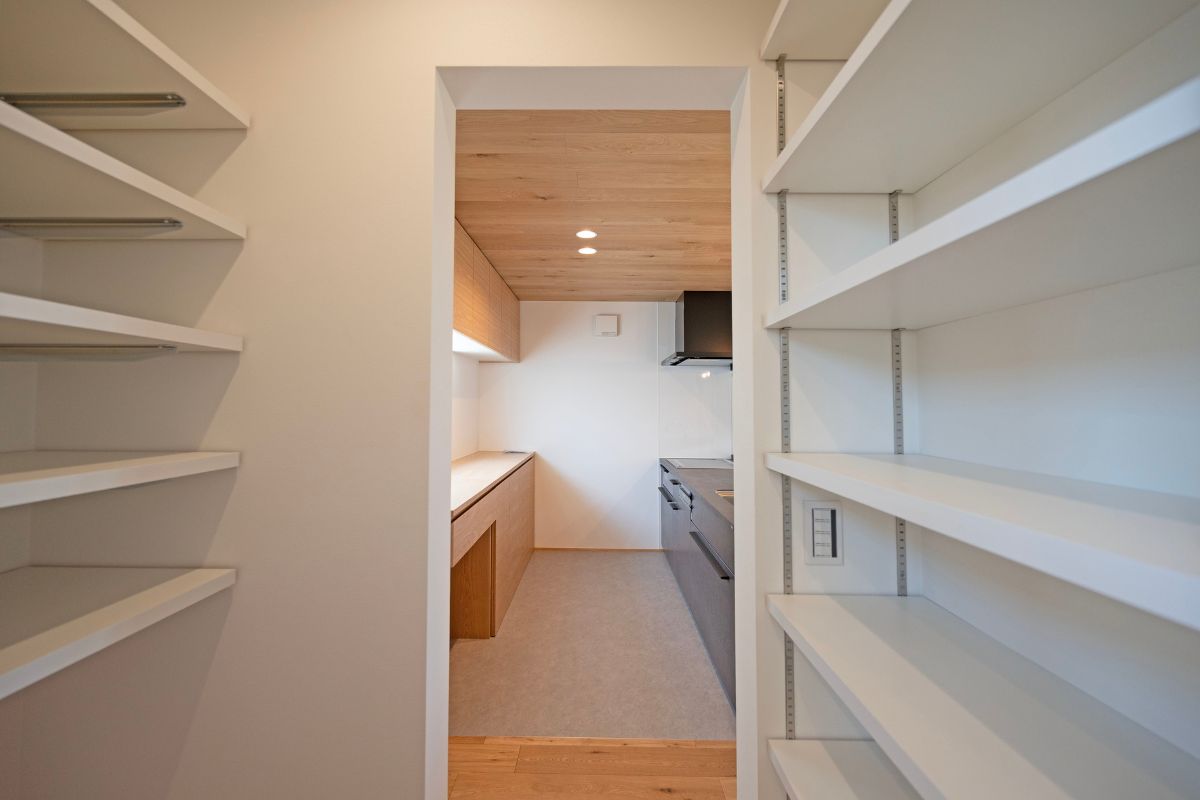 ストックやキッチン家電をしまえるパントリー付きで、生活感をさっと隠せるのが嬉しい。急な来客でも、すっきり片付いた空間でお迎えできます。