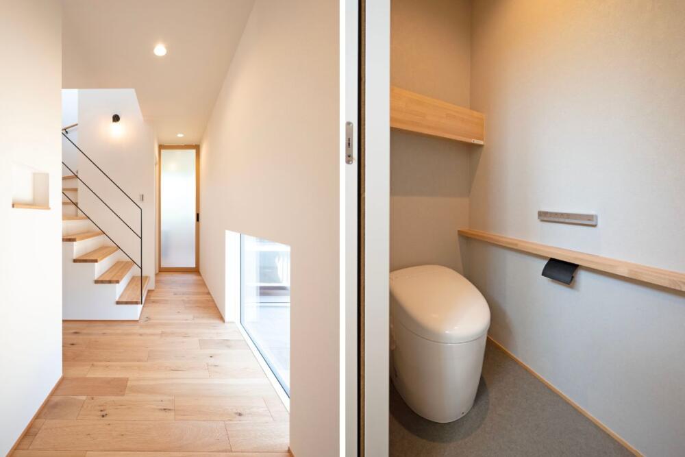 トイレは、無駄を省いたミニマルなデザインに、木の質感を添えることで、落ち着いたやさしさを感じられる空間に。