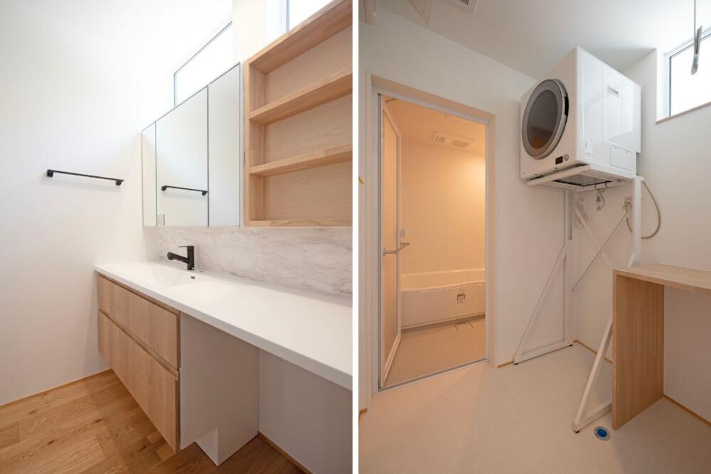 洗濯機とガス乾燥機「乾太くん」を備えたランドリールーム。その場で干して、そのまましまえる動線設計で、家事の時短を叶えます。忙しい共働き家庭にもおすすめ。