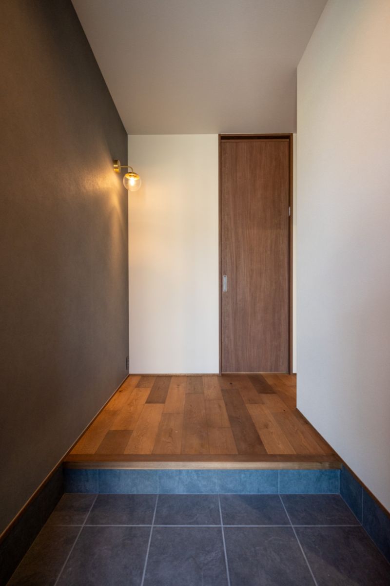 玄関は落ち着いた色味のアクセントウォールと間接照明で、住まいの第一印象を上品に。来客を迎えるたび、ちょっと誇らしくなるような空間です。
