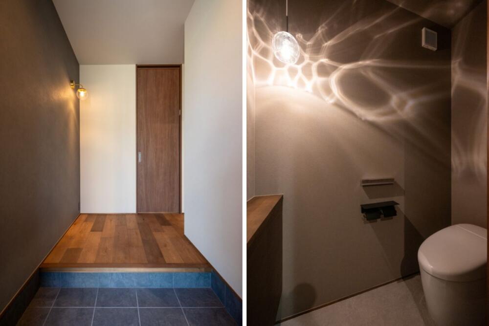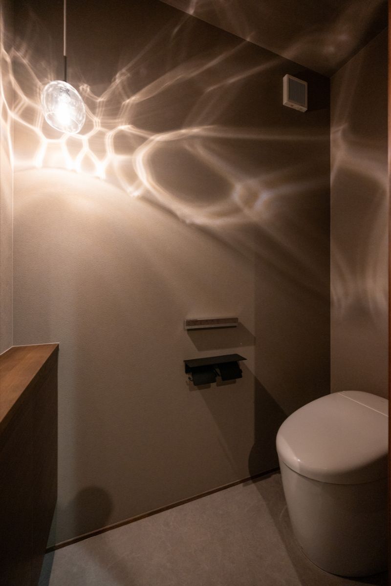 トイレは照明が壁に美しい影を落とし、シンプルながらも上品な雰囲気に仕上げています。