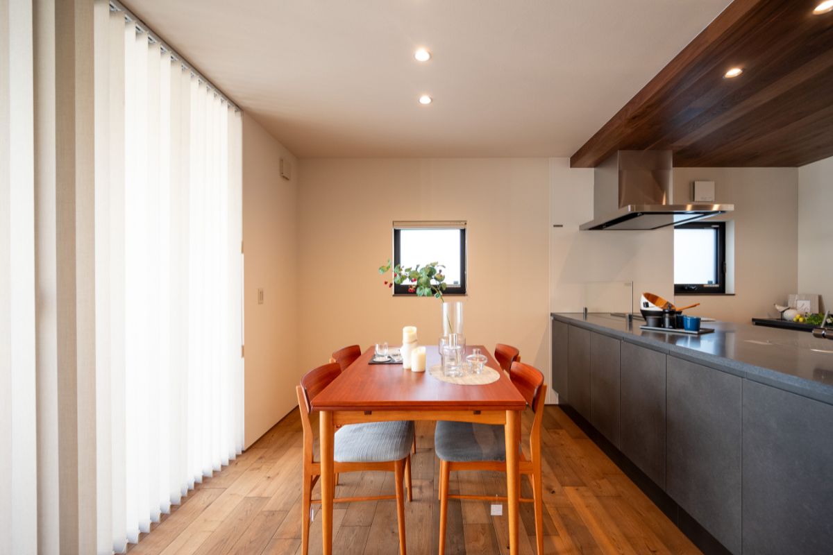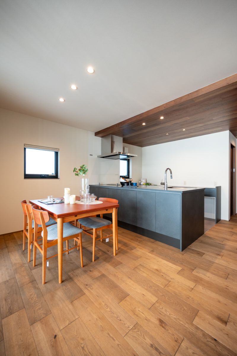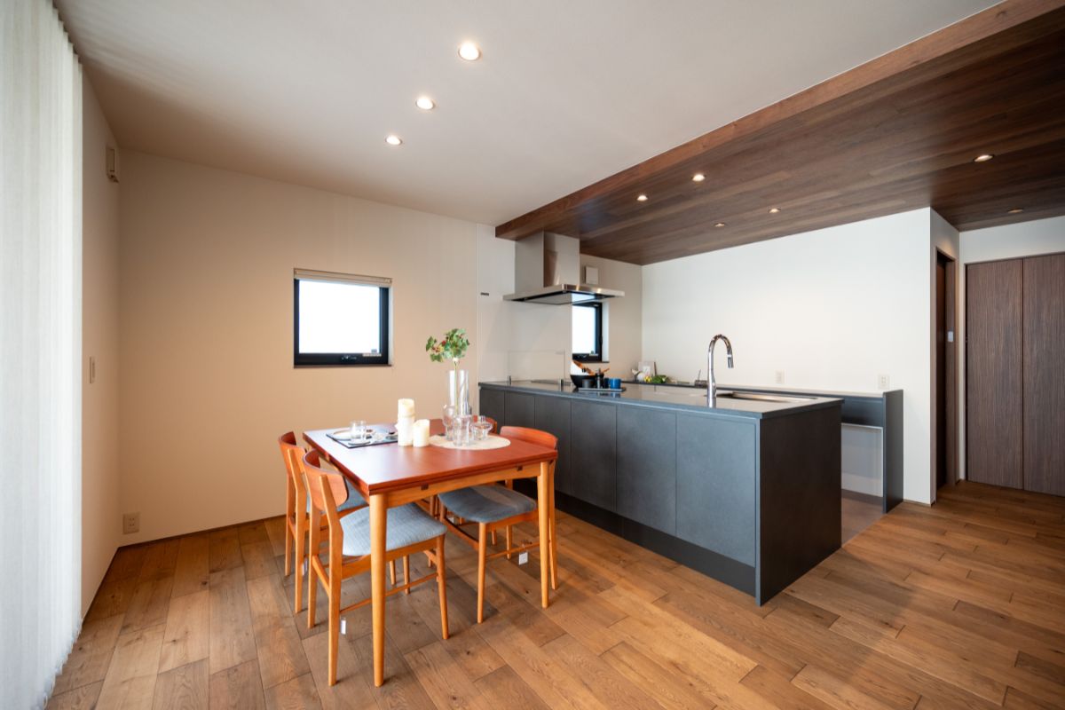 木の温もりを感じるダイニングと、スタイリッシュなブラックのキッチンが調和した空間。