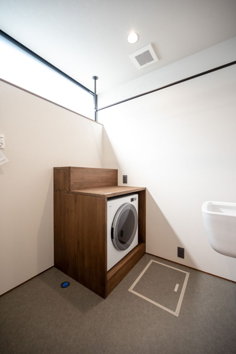 ランドリールームは、乾太くんを組み込んだ造作収納で、家事のしやすさと美しさを両立。
