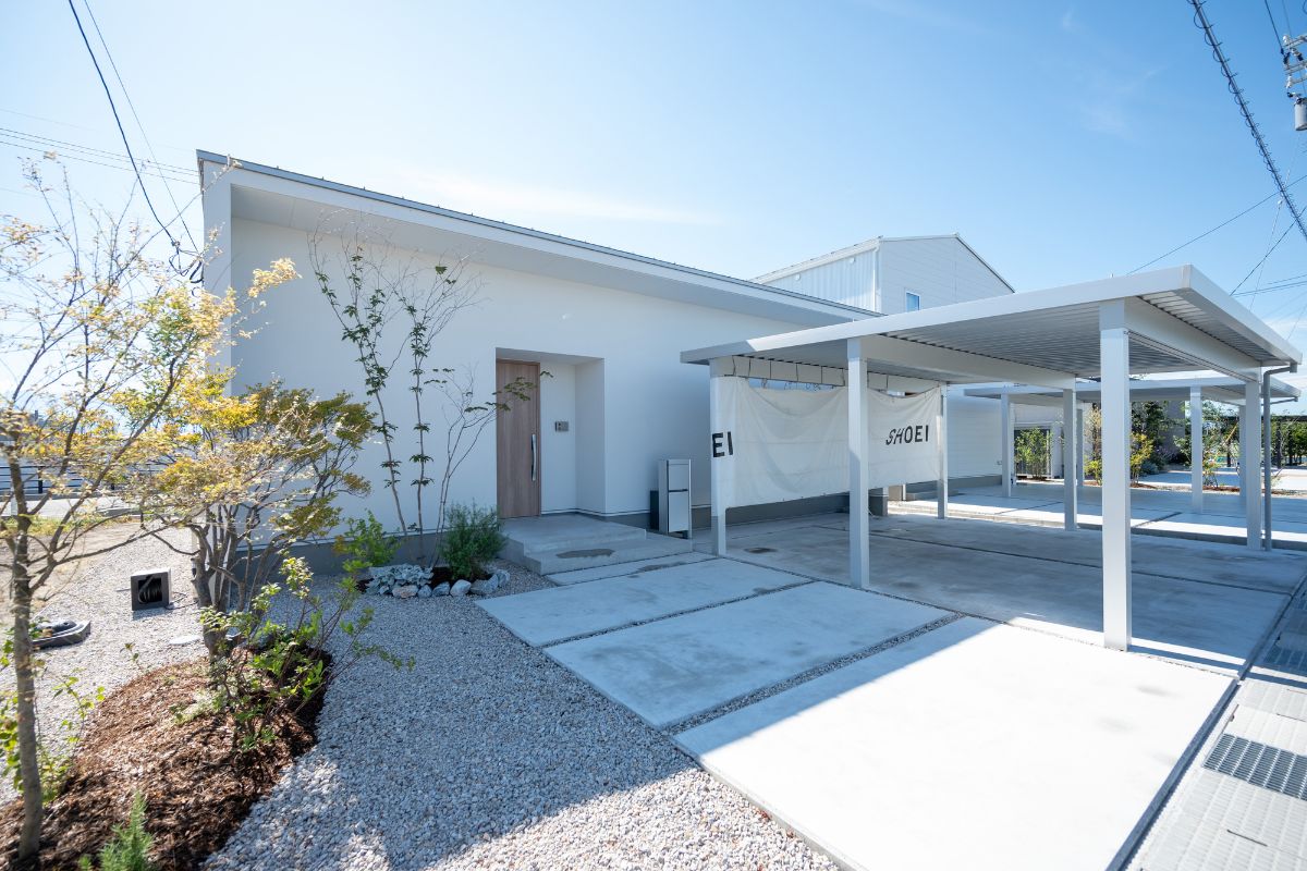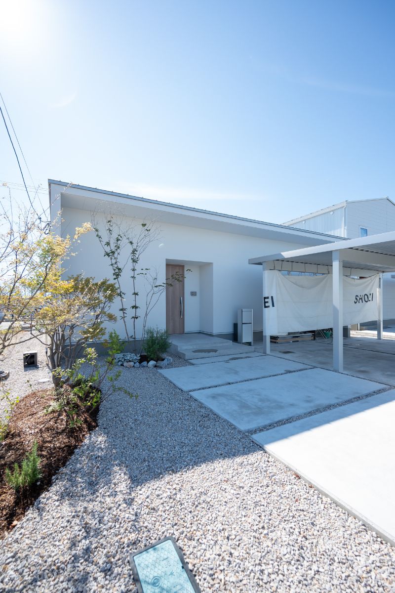 高さを抑えたフォルムと、軒・カーポートまで一体で整えた外観デザイン。