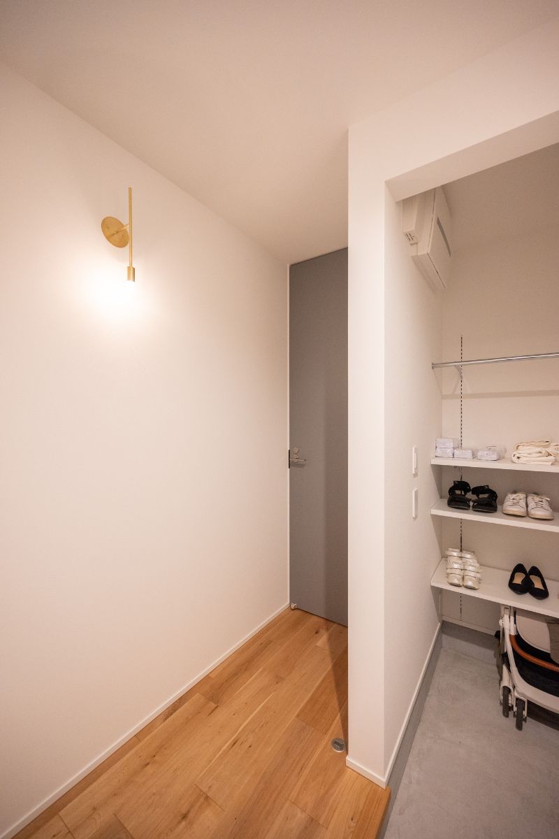 靴や日用品をすっきり収められる収納計画で、玄関はいつも整った印象に。