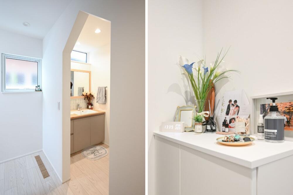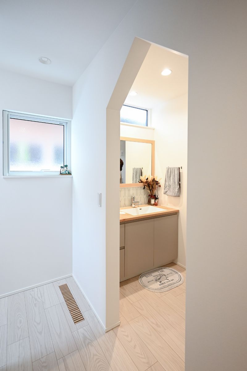 洗面のの入り口の垂れ壁を、よくある丸ではなく三角にしたそうです。