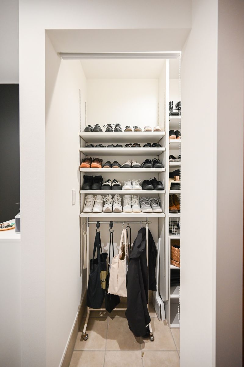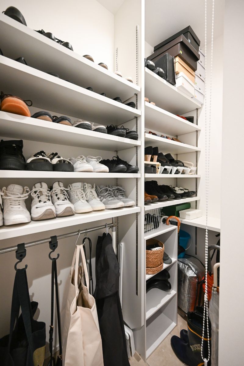 ▲ 靴の正面を手前に。綺麗に収納されたシューズクローク。