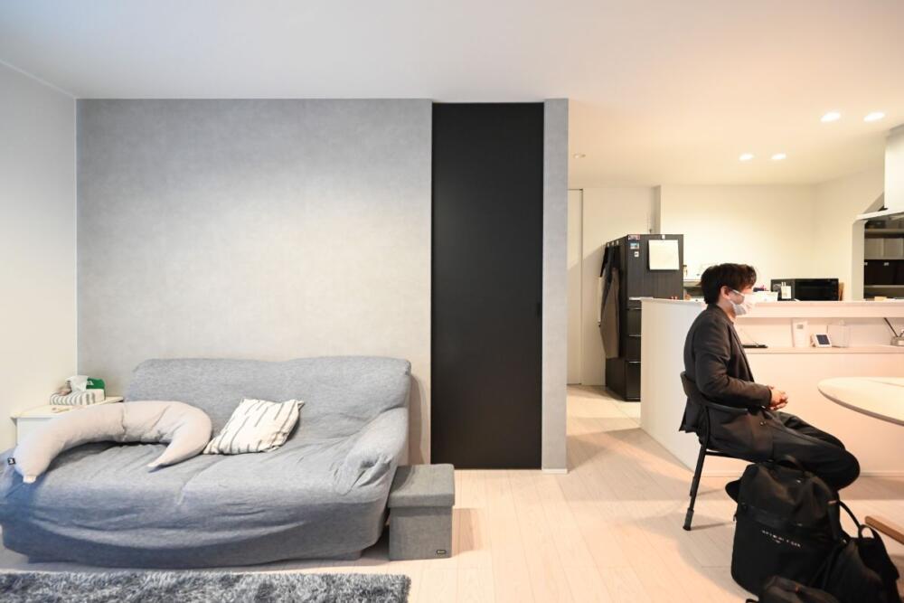 ▲ リビング側の一面をグレーのアクセントクロスとブラックの扉に。